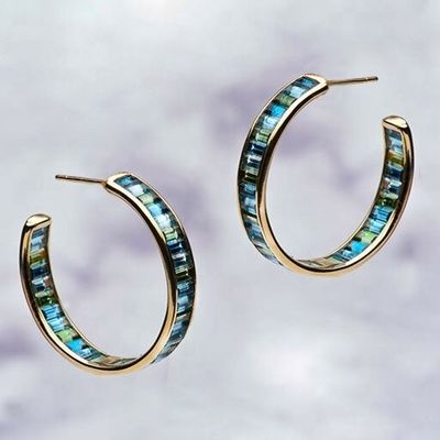Gold Plated Earrings Baguette Blue and Green Topaz Stud Hoops